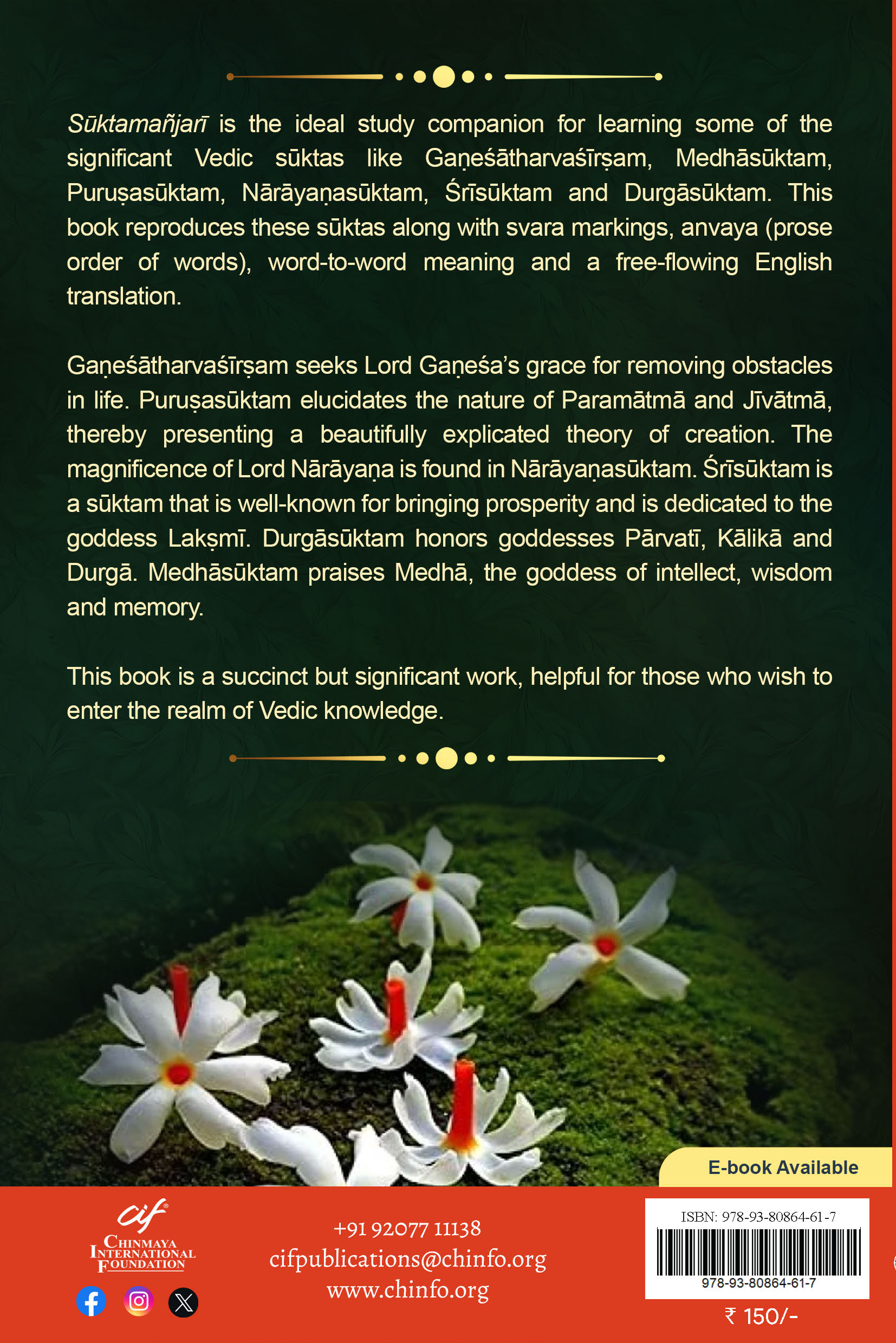 Sūktamañjarī is the ideal study companion for learning some of the significant Vedic sūktas like Gaṇeśātharvaśīrṣam, Medhāsūktam, Puruṣasūktam, Nārāyaṇasūktam, Śrīsūktam and Durgāsūktam. This book reproduces these sūktās along with svara markings, anvaya (prose order of words), word-to-word meaning and a free-flowing English translation.