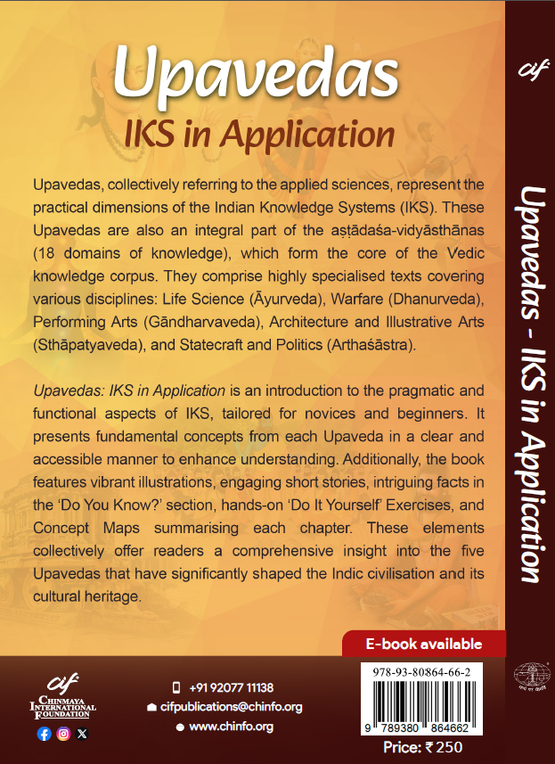 Upaveda is an introduction to the pragmatic and functional aspects of IKS, tailored for novices and beginners. It presents fundamental concepts from each Upaveda in a clear and accessible manner to enhance understanding. Additionally, the book features vibrant illustrations, engaging short stories, intriguing facts in the ‘Do You Know?’ section, hands-on ‘Do It Yourself’ exercises, and concept maps summarising each chapter. These elements collectively offer readers a comprehensive insight into the five Upavedas that have significantly shaped the Indic civilisation and its cultural heritage.